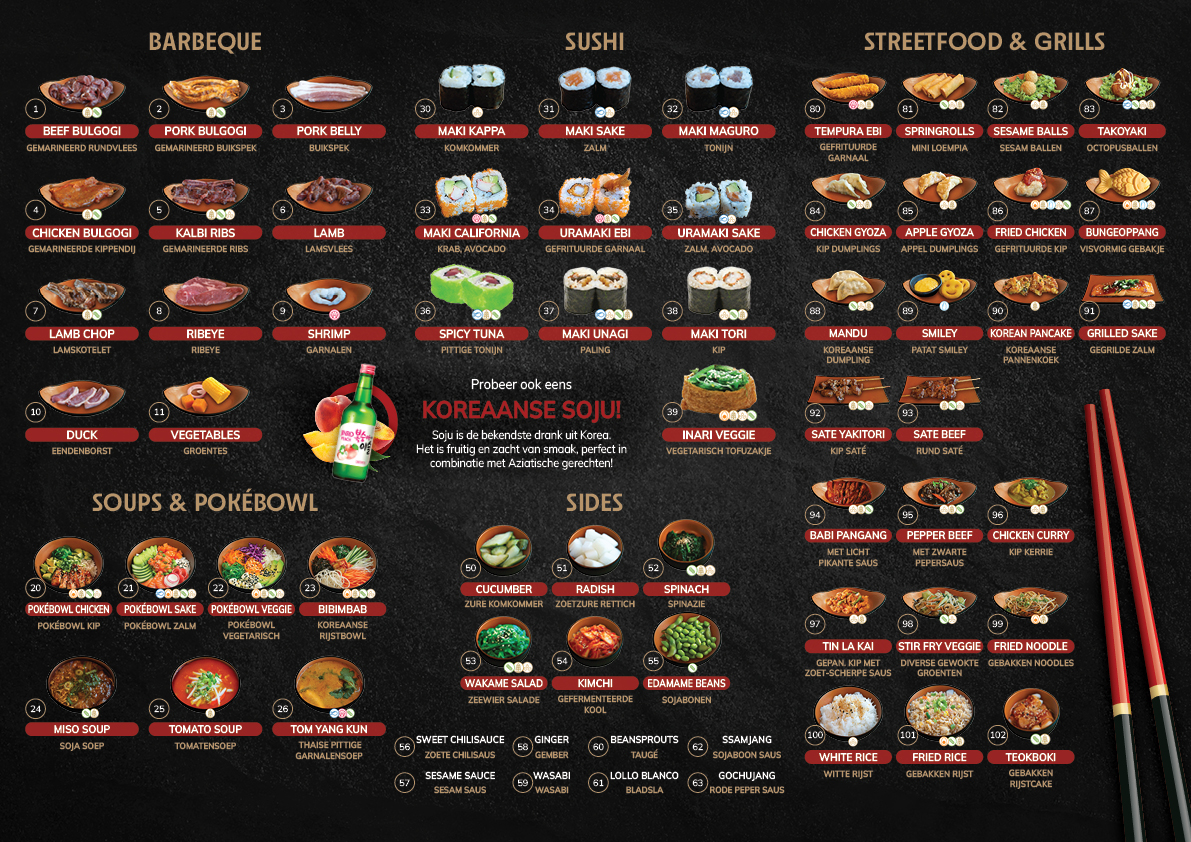 Ervaar de authentieke Asian BBQ door zelf je vlees en vis te grillen op een grill aan je tafel. Onze huisgemarineerde specialiteiten zorgen voor een smaakexplosie die je zelf op de perfecte manier kunt bereiden. Naast de barbecue kun je ook genieten van een uitgebreide selectie verse sushi, kimbap en Aziatische streetfood.